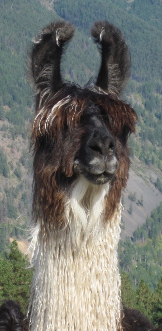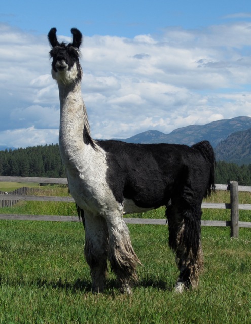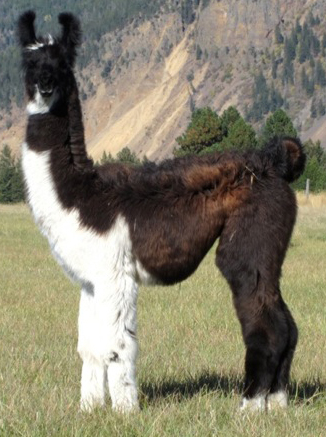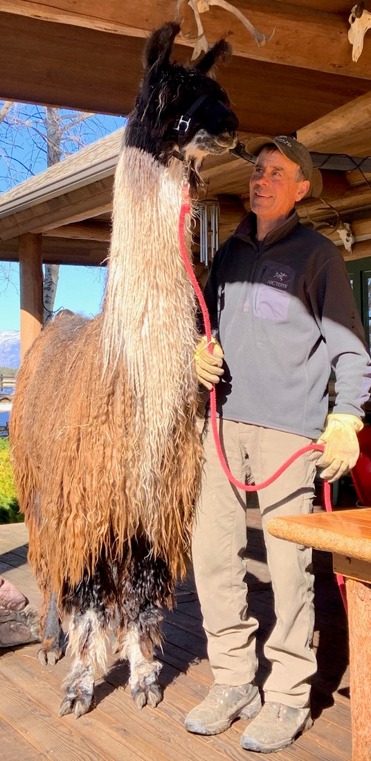 Tesio stands 51.5” at the withers, 80” at the poll. He has a gentle yet confident demeanor, and we’ve never had a more easily trained llama. He was leading calmly and traversing our house decks within minutes of his first haltering.