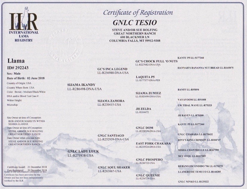Tesio’s dam line goes back eight generations at our ranch. His dam, Lady Luck, is known for producing size while adding her exotic looks and gentle temperament. These attributes don’t come by accident; they follow all through this dam line, from Queenie and Ninko to Soul Shaker, who is Merlin’s giant, full sister and Tesio’s grand-dam.